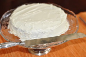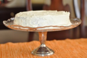 In an attempt to diminish the beta-carotene invasion I decided to make carrot cake, my husband’s favorite. I found a recipe online, Paula Deen’s Grandma’s Recipe to be exact, and endeavored to bake a cake that both the husband and little guy #1 would like. The only substitution I made was melted butter for oil and extra pecans. The cake was scrumptious!