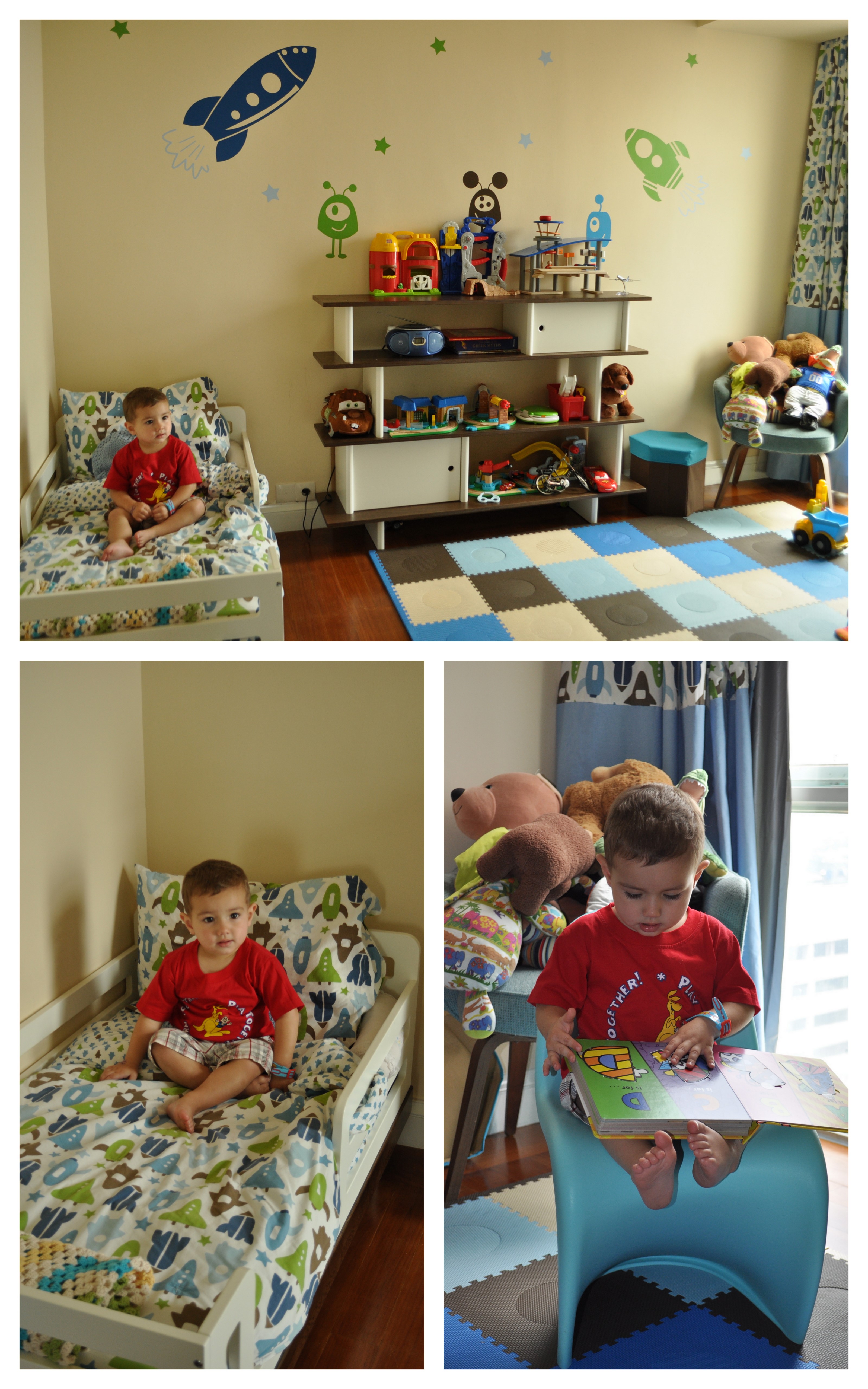 We are not yet done decorating his room. It’s still missing artwork and photos but it’s a work in progress. Again, we had Ibu Nifa make curtains for his room. We just bought curtains that matched the bedding and she modified them to fit the floor to ceiling window.