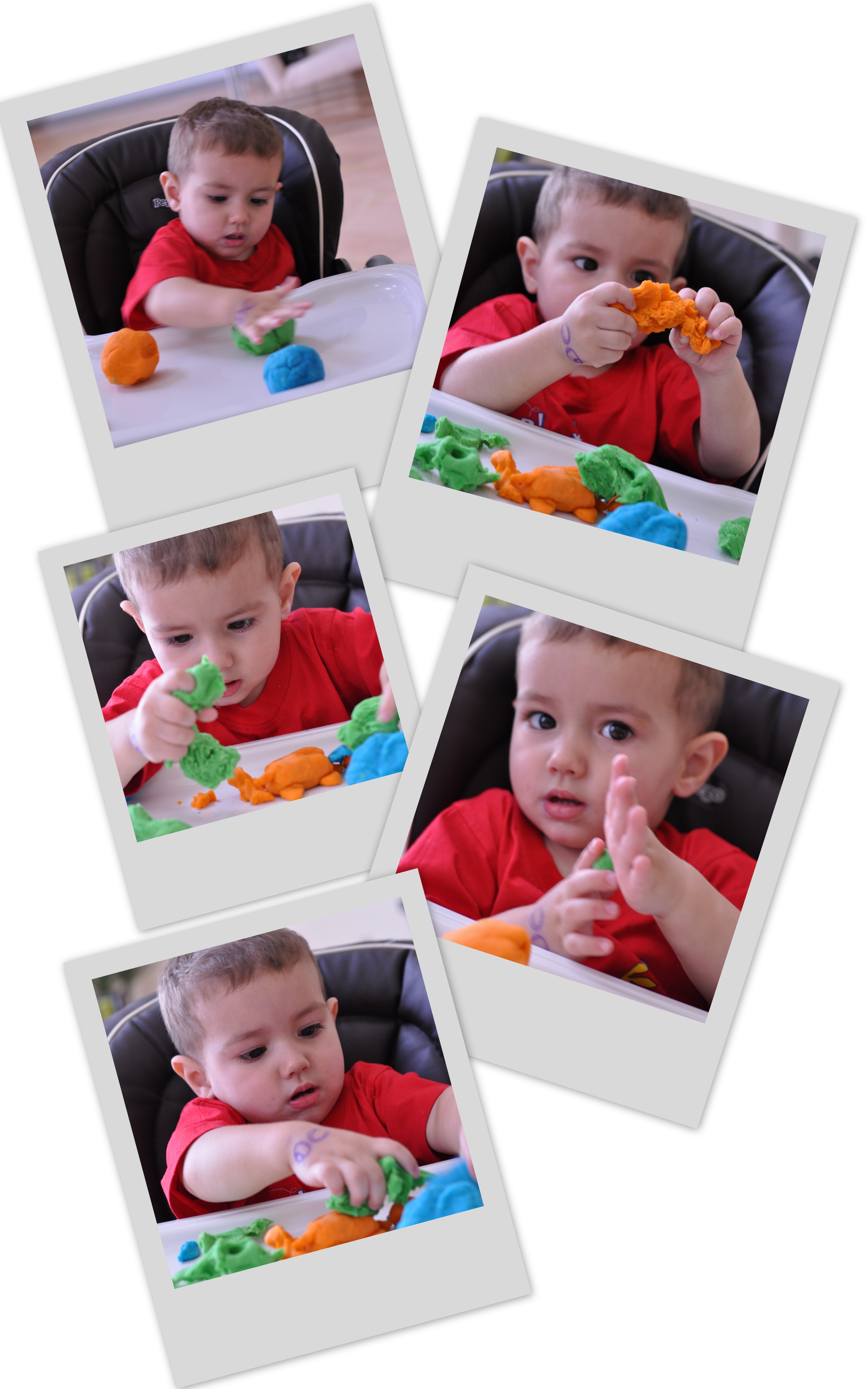Evan helped me knead the dough a little bit but wasn’t interested in adding color to it. After I colored the dough, Evan was very excited to have some play dough to play with and mommy was very excited that she didn’t have to deal with traffic getting to the mall (and at the mall) to buy an expensive imported toy that would end up hidden in a corner of his room to dry out.