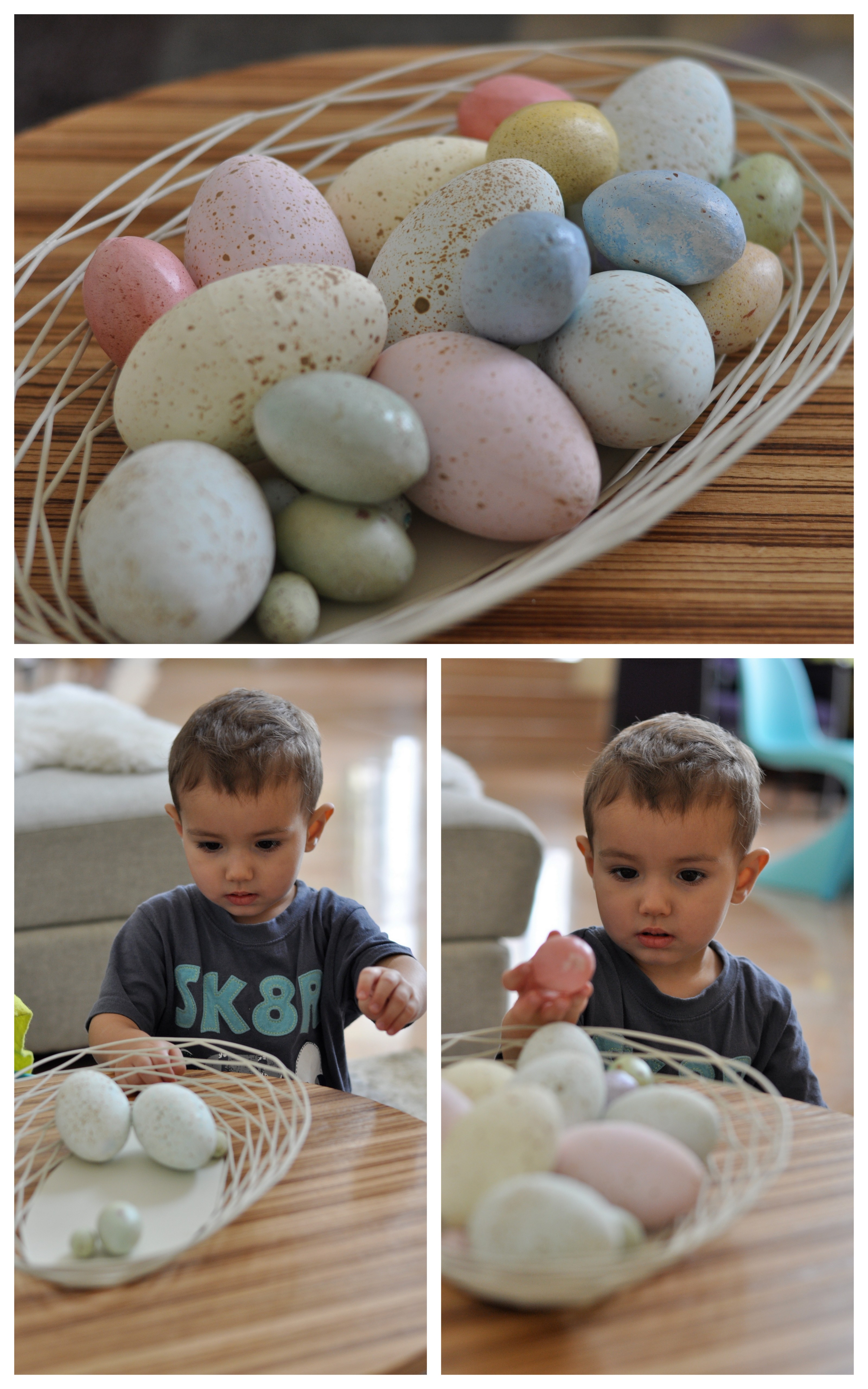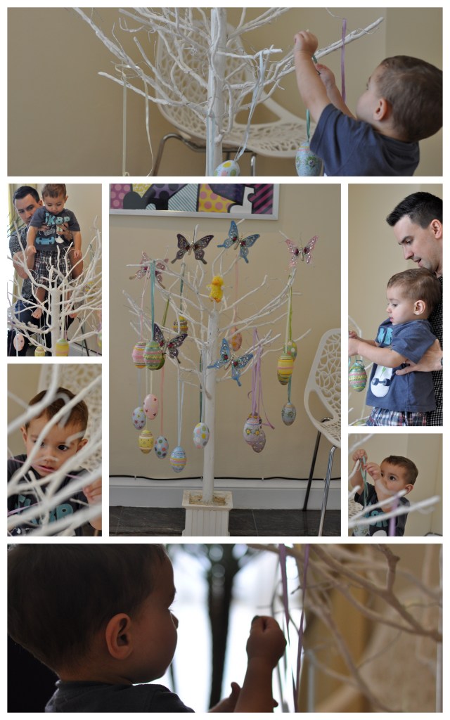 Last weekend, I found my “holiday” box and took out every single Easter items could find there. Evan was quick to play with them and he helped me put the eggs on the tree. We are still not done putting up decorations but we sure had a good time hiding some of the eggs and letting Evan find them.