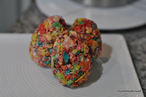I’ve been trying to make special treats with holiday themes for the kids. Easter was no exception and I was lucky to find this recipe in my good friend Loren’s blog toddlejoy.com. It’s just a marshmallow cereal treat shaped as an egg. I loved how she used fruity pebbles. They are so colorful and perfect for the spring season. These treats are very simple and they look über cute!