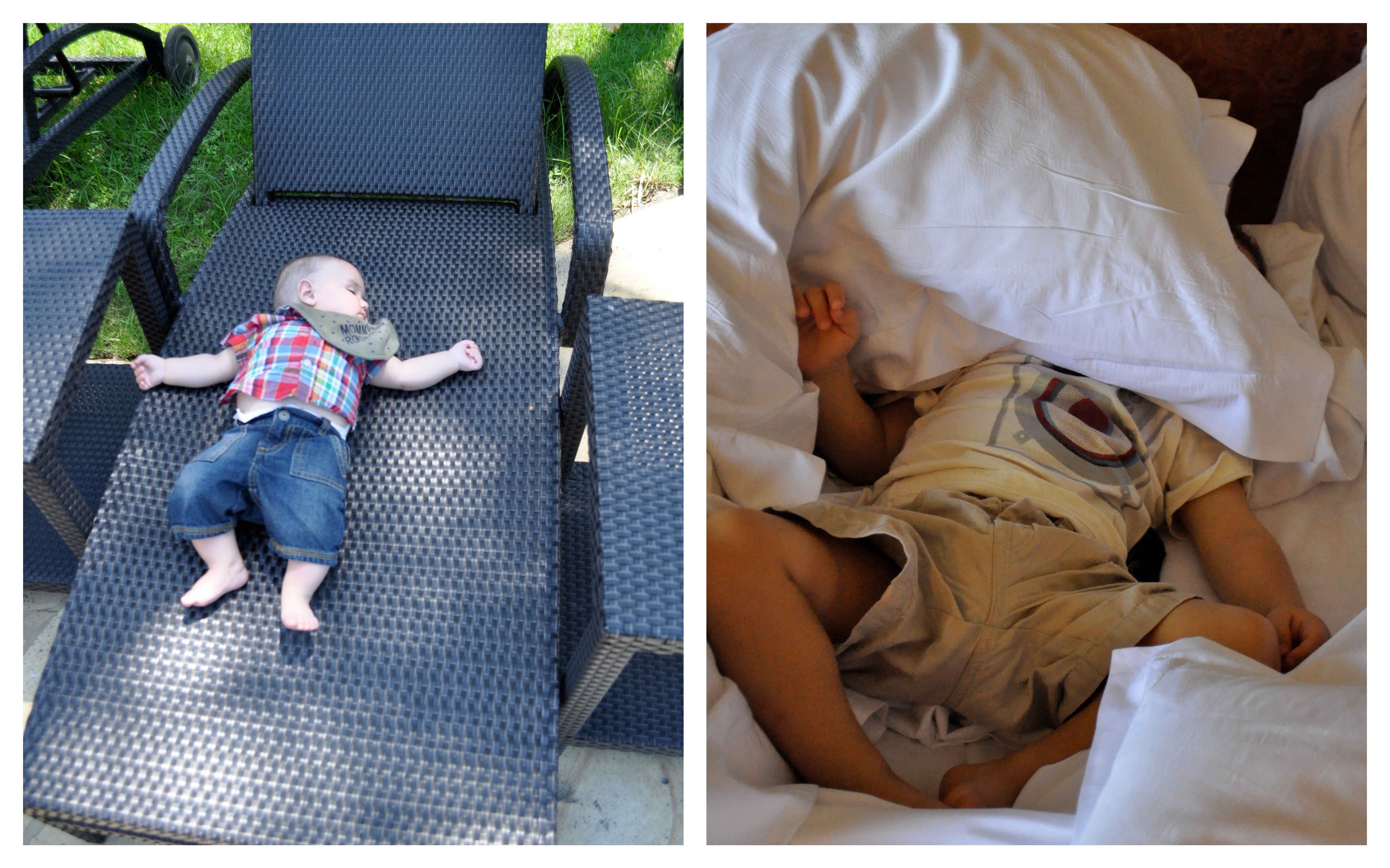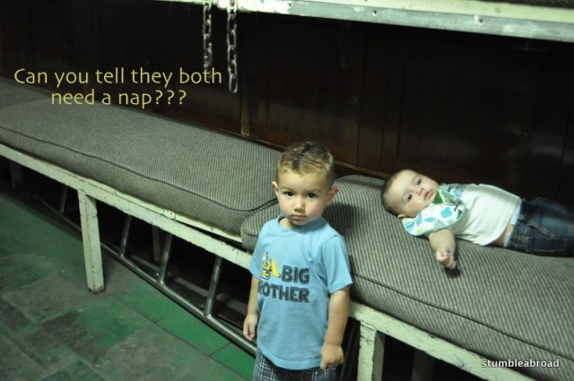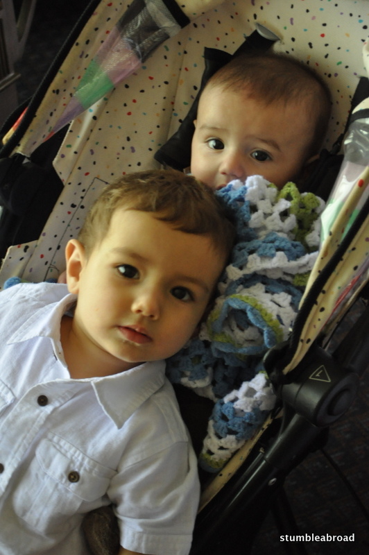 To tell you the truth, this wasn’t so bad. Originally I had the Baby Bjorn and the stroller but an 18-pound baby was too much to carry on my chest so I chose to let Evan walk and put Josh in the stroller. Evan was great at walking, the problem was when they both fell asleep. There was no way for me to be able to hold them both at the same time. I was so grateful for great hotel staff that would help me carry Evan into the room when he fell asleep riding the taxis.