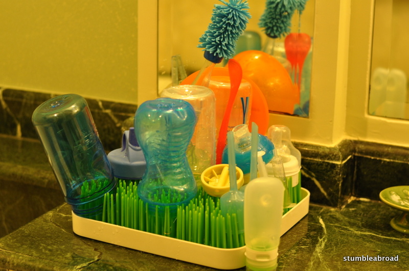 From sweat, spit-up and whatever on earth they were eating or playing with that day. I brought enough clothes to last me thru the whole trip, however I was not contemplating that toddlers love to get dirty and it’s in the infant’s nature to do so. So I had to wash clothes, in a tiny bathroom sink because just putting them back in the suitcase would entail a very stinky baggage and probably ruined clothes.
