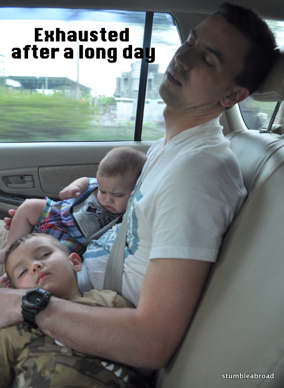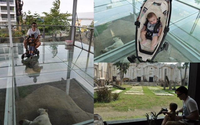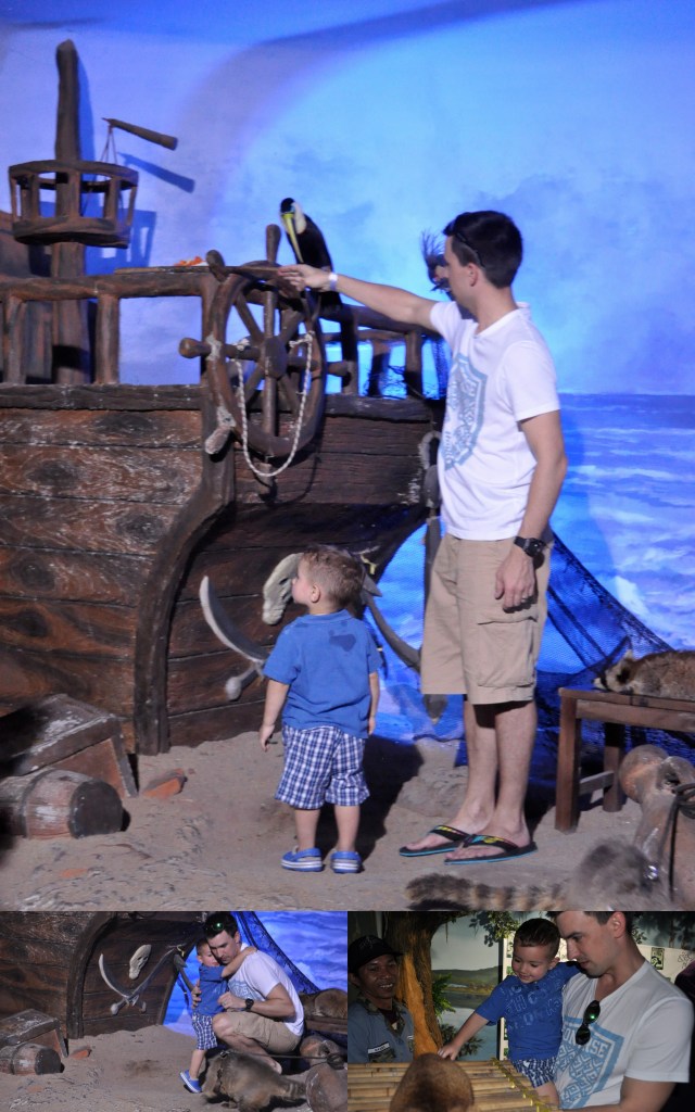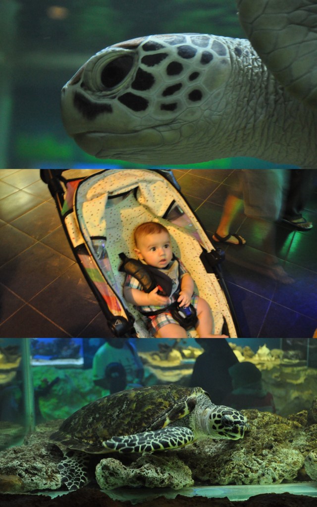 After a somewhat long and crowded walk, we entered the aquarium. Finally, some AC, but wait, what’s that smell??? Anyway, it was very clean and very well-kept despite the fishy smell. The best part of the aquarium for me was to see Joshua fixating on the turtles. I’ve never seen him observe anything son intently. In two different areas of the aquarium they have animal petting and photo-op areas. They were so much fun! Evan and daddy played with what we think was some kind of monkey and later took pictures with several birds including an owl and a toucan.