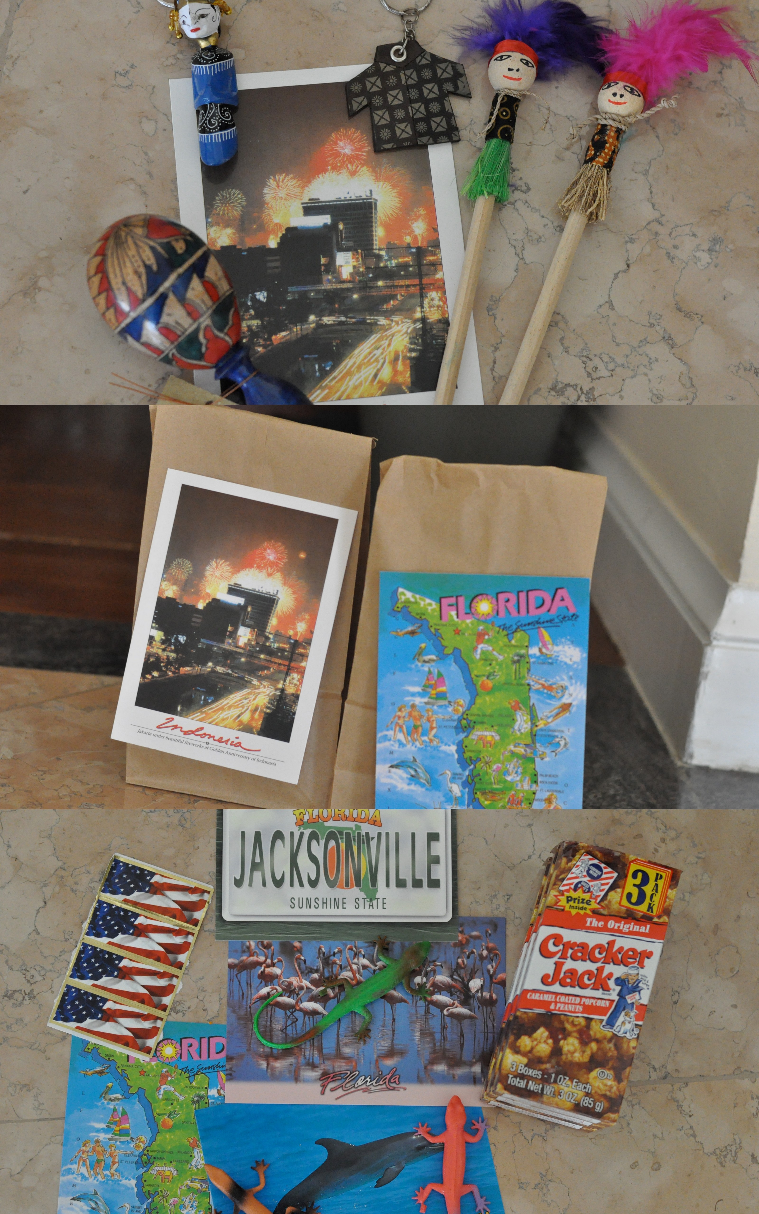 Like we mentioned before, we decided to represent Mexico, Florida and Indonesia. My dad got really excited when I told him about the exchange and he was very kind to send me lots of things from traditional Mexican markets. We also put things from Florida that my in-laws graciously sent us even though my mother-in-law had recently had surgery. Finally, Evan and I went to handicraft store here in Jakarta and picked a few things to add to the package.
