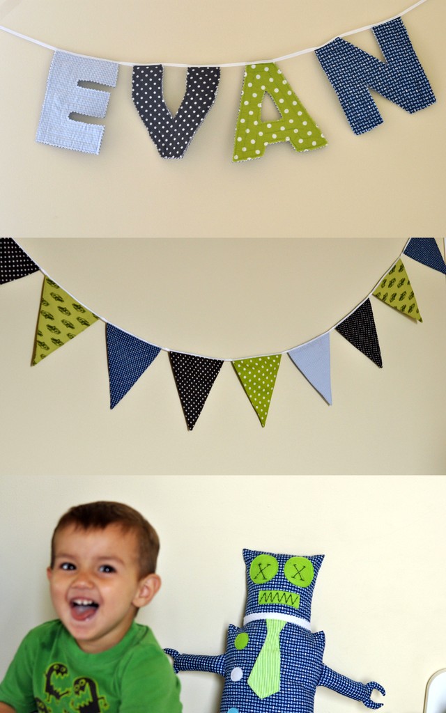 Today, we finally changed the pink curtains to yellow and we are slowly working on transforming my lil’ man’s room into the nursery he deserves. I hope to finish the nursery in the next few weeks and on the mean time I just have to show you the super cute fabric banners and robots I had made with Strawberry Patch for Joshua and Evan’s room.