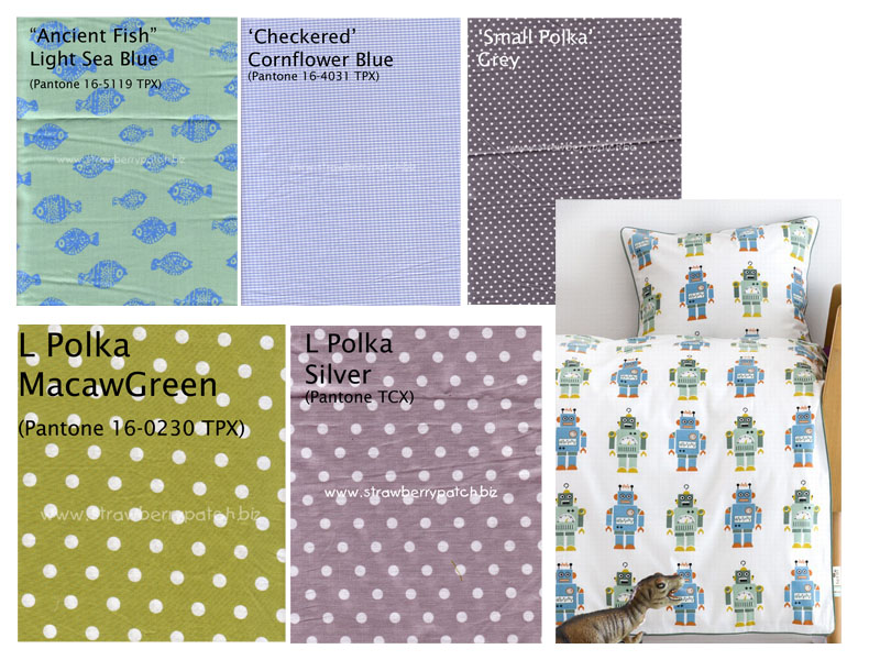 I immediately contacted Ayu, the owner and designer of Strawberry Patch and asked her if she could custom-make a robot that would match the colors of the bedding as well as a flag banner and a name banner. She was just so awesome that she even sent me samples of the fabric she had and made a nice little collage with the colors she thought matched the bedding.