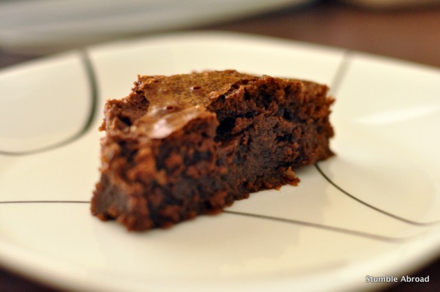 It turns out that after cooking an almost-flourless cake it is ok to let the cake cool down and finish baking outside. The end result: a scrumptious, moist in the inside (almost fudge-like), crispy outside, little slice of chocolate heaven.