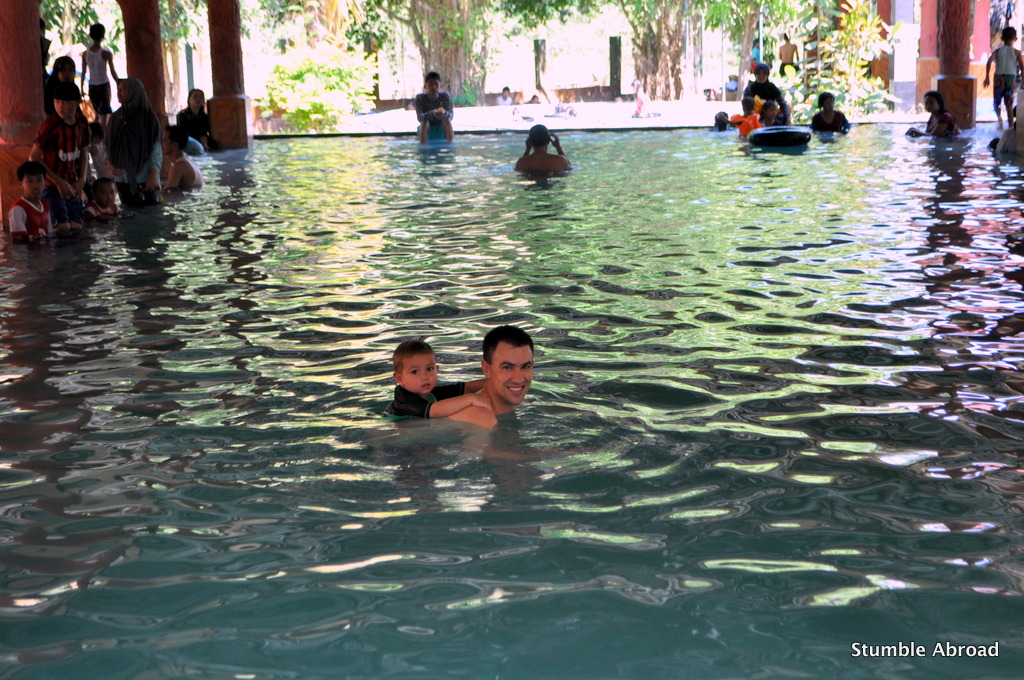 After amazing at the hot springs (a first for me) we were led to what seemed like a small pool area. Before actually going in, the husband “inspected” the site and decided it was worth visiting. After paying the lofty amount or 2,500 rupiahs (about 35 cents US) per person we went in. We changed in the dressing rooms as the local ladies held Joshua and pleaded me not to take him in the water but rather let him stay in their arms.
