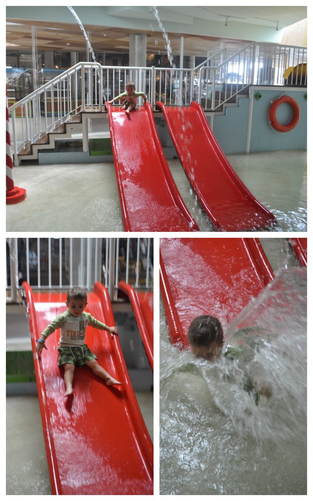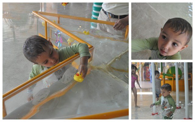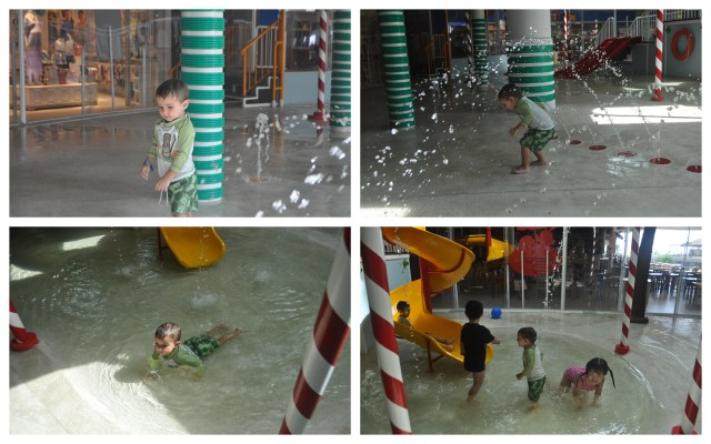 We tried Mr.Cricket’s Lagoon soon after. I thought that might be better in order for him to be able to get dry and so that I could drag him out of the dry playground, not the wet one. The lagoon does not have a bathroom right by it but they have a great changing room and shower area just down the hall. They have a small locker room area and cute small toilets for the kids to use. As soon as Evan suited-up he ran into the lagoon and had a blast. Warning: the water is COLD! He didn’t care but when I dipped my toes in the water I cringed. Evan didn’t mind at all and had a fun time specially when the girl in charge of the area started chasing him around and playing with him.