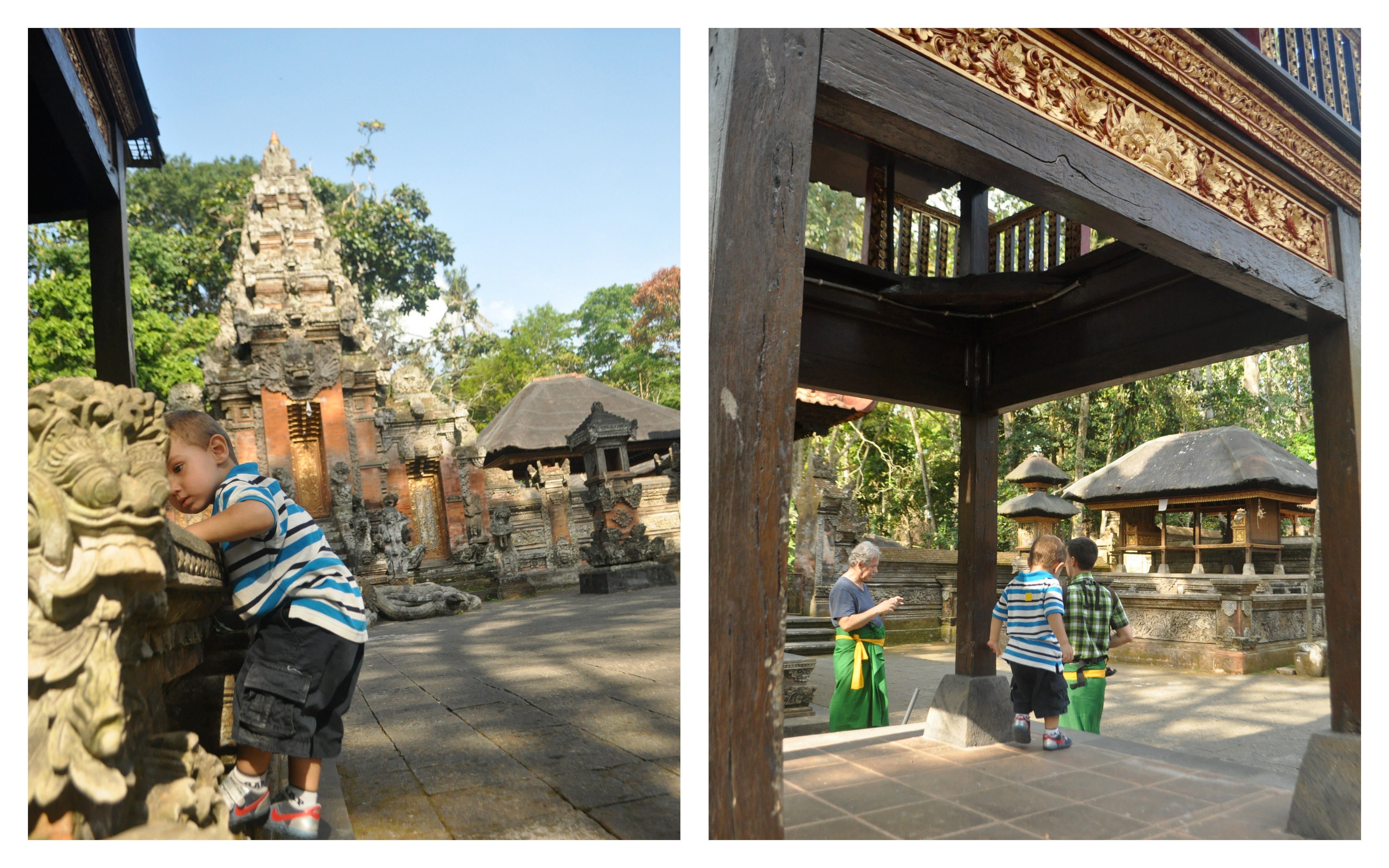 Monkeys here, monkeys there, monkeys everywhere! I must confess I was hesitant to visit this place. I wasn’t sure if the monkeys would attack the boys and I didn’t want my camera to get stolen! Once we got there I was glad to find a very well-organized and lush green place. The ticket costs 20,000 rupiahs and you are able to buy bananas to feed the monkeys just outside the sanctuary. As you walk thru the forest monkeys approach you and quietly observe if you have anything that they might fancy. Evan tried to touch a baby monkey and mama monkey got very upset and screamed at Evan. You can guess Evan was not happy and jumped into my arms. Once he calmed down we continued trekking thru the cobblestoned lanes and paid 10,000 rupiahs to get “saronged” and enter one of the temples. Monkeys roamed around freely and the toddler did too. I would definitely say this place is worth visiting, just beware of your wallets and any shiny objects! Monkey Forest Website.