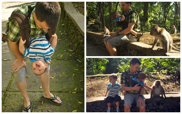 It doesn’t really matter which temple you decide to visit. They are all very similar and give you a clear glimpse of Hindu sanctuaries. You will usually have to pay a menial fee to get a sarong wrapped around your waist and you are able to buy flowers and other offerings right at the temple. Evan loves to run around the temples and look at the gargoyles. Josh loves the attention he gets from all the local ladies who work there and doesn’t mind getting his picture taken by the locals. The one temple that is definitely unique is the Uluwatu temple that lies by a cliff and is home to hundreds of monkeys. I wrote more about our visit to Uluwatu here.