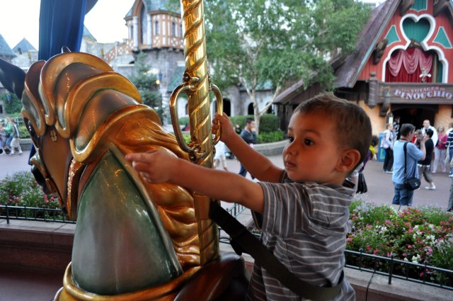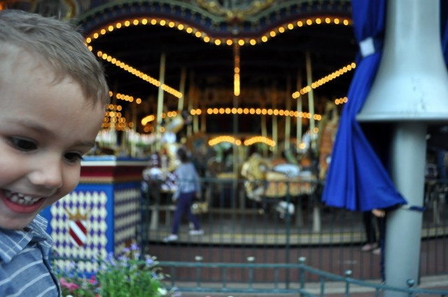 We stayed mostly in the Fantasy Land area and Evan got very excited every time he saw a character walk by. We rode on the Peter Pan, Snow White, Pinocchio and Dumbo Ride and got on the carousel several times. The highlight for Joshua was the It’s a Small World ride. He was so excited and loved looking at everything. We rode on it like four times!