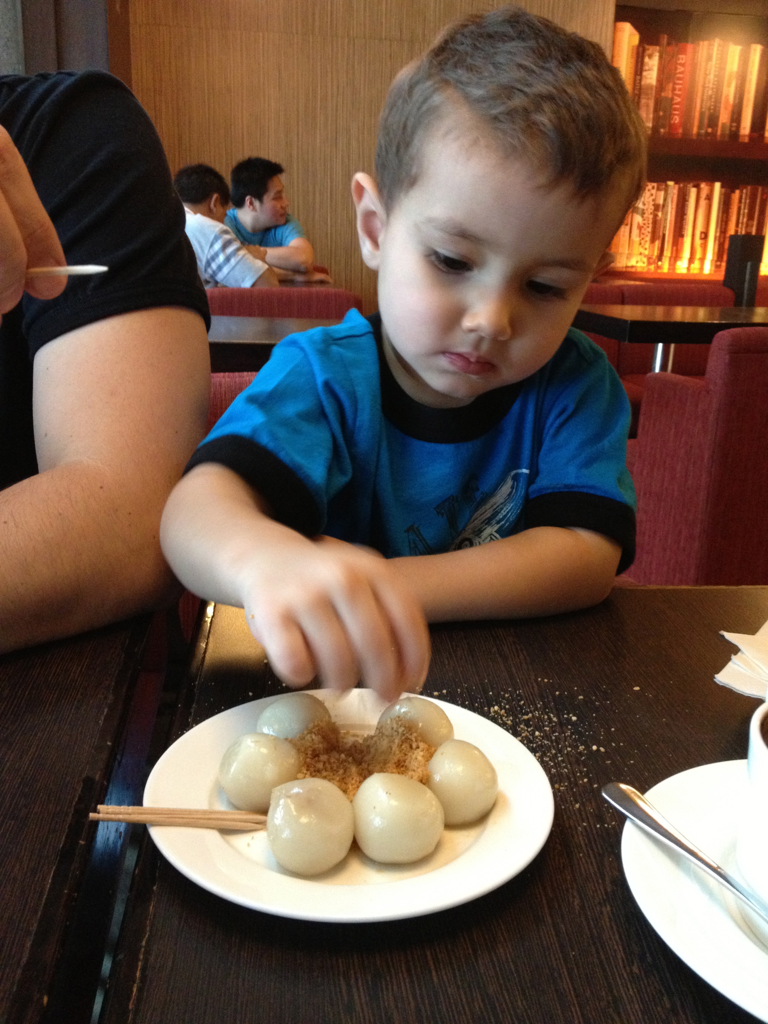 My hubby, apparently advised by the very savvy toddler, ordered glutinous rice balls filled with sesame paste. I had a bite and it was delicious. It had a lot of depth of flavors and the chewy exterior neutralized the strong flavors inside.