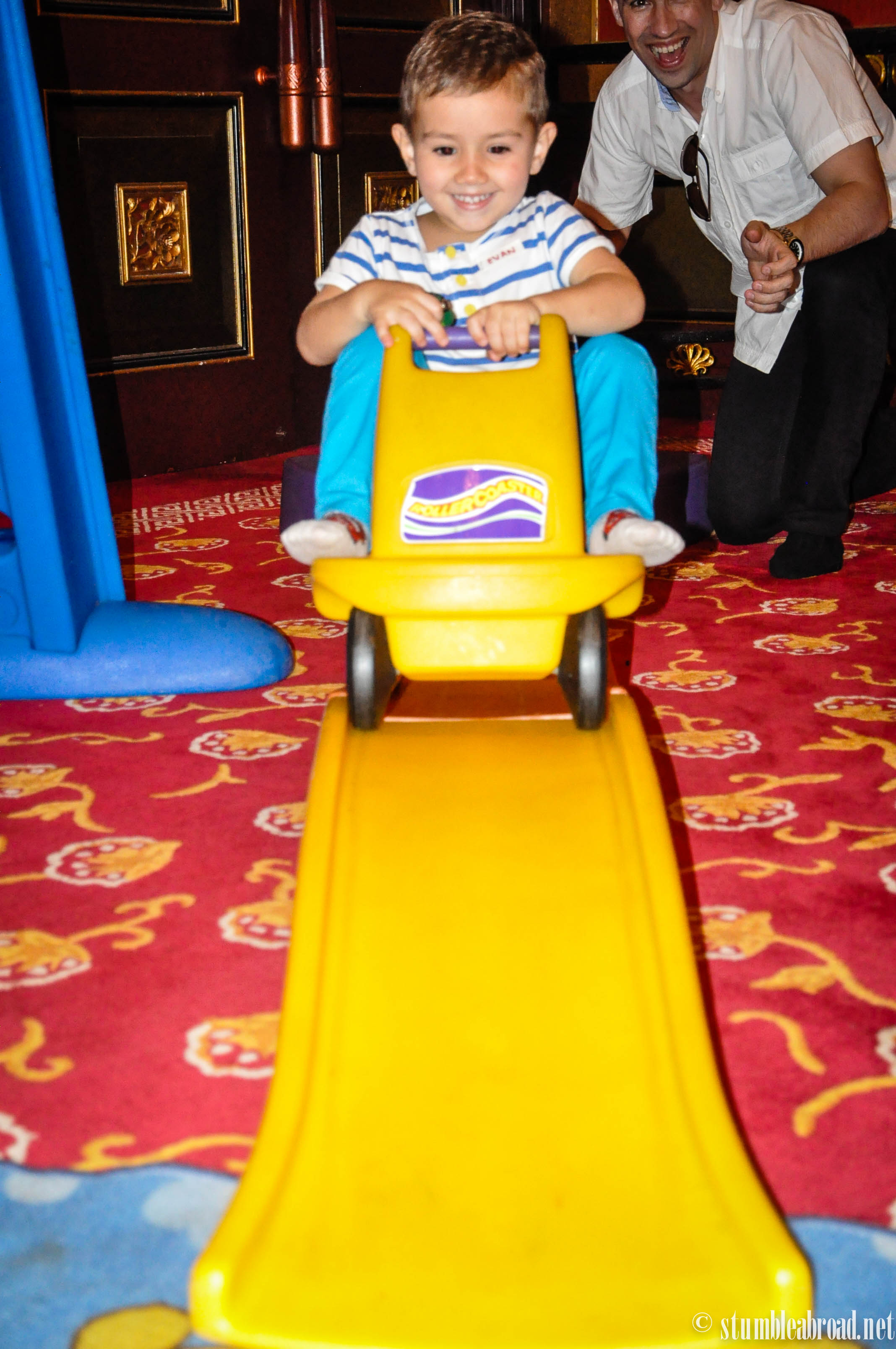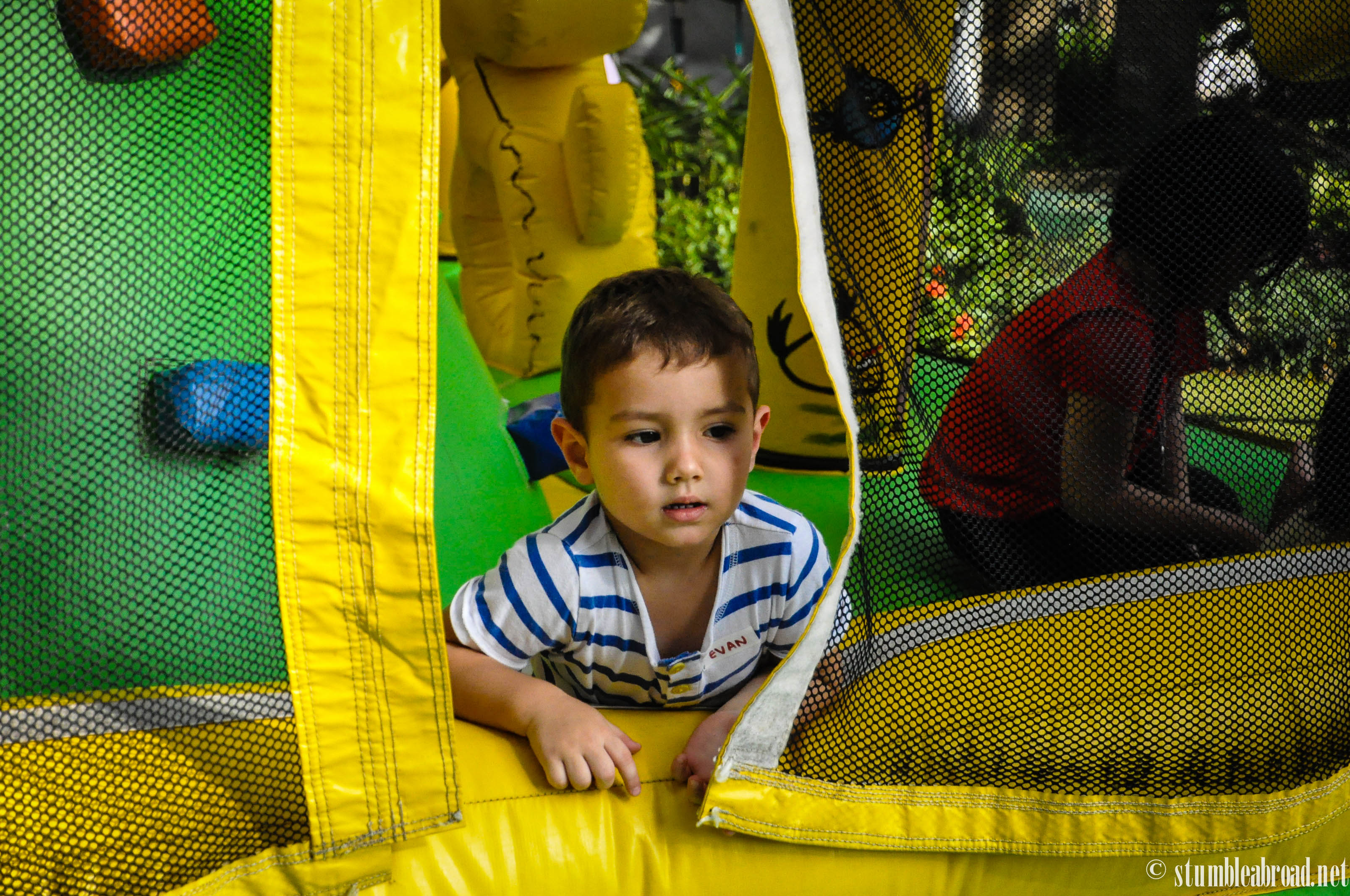 Soon after we arrived we learned that their weekend activities begin Saturday morning at 11:00 AM. We got there around 2:00 PM and missed out on the cupcake decorating class and cooking demonstration but were excited to see many other activities on the schedule for the day. For people staying at the hotel, the weekend activities are included in the stay (staycation, anyone???), for visitors the entrance fee is 50,000 Rp. per child. They also offer extra activities such as t-shirt decoration, cooking classes, and other crafts for an extra fee. We thought the price was more than fair for all they had to offer. Evan and Joshua’s smiles and the fact that daddy and I were actually able to sit down for a few minutes and watch them play will testify to that.