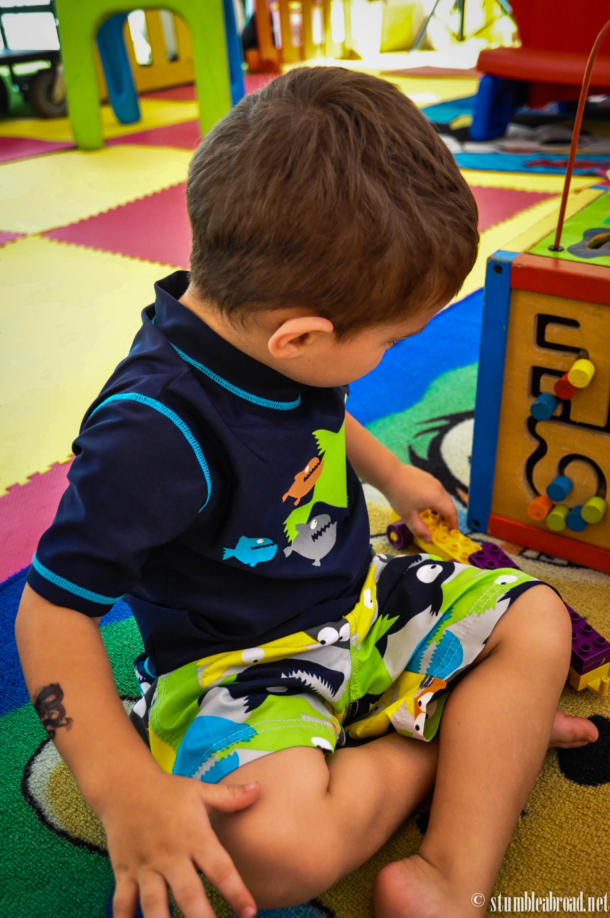 The first time we visited the Shangri-La for the kid’s activities the play area was located in the function room because there was a wedding taking place in one of the gardens where they usually set up the play area. We loved having the option to be either inside or outside. The AC was a nice break from the heat and humidity of Jakarta and the free iced tea and water was a big plus.