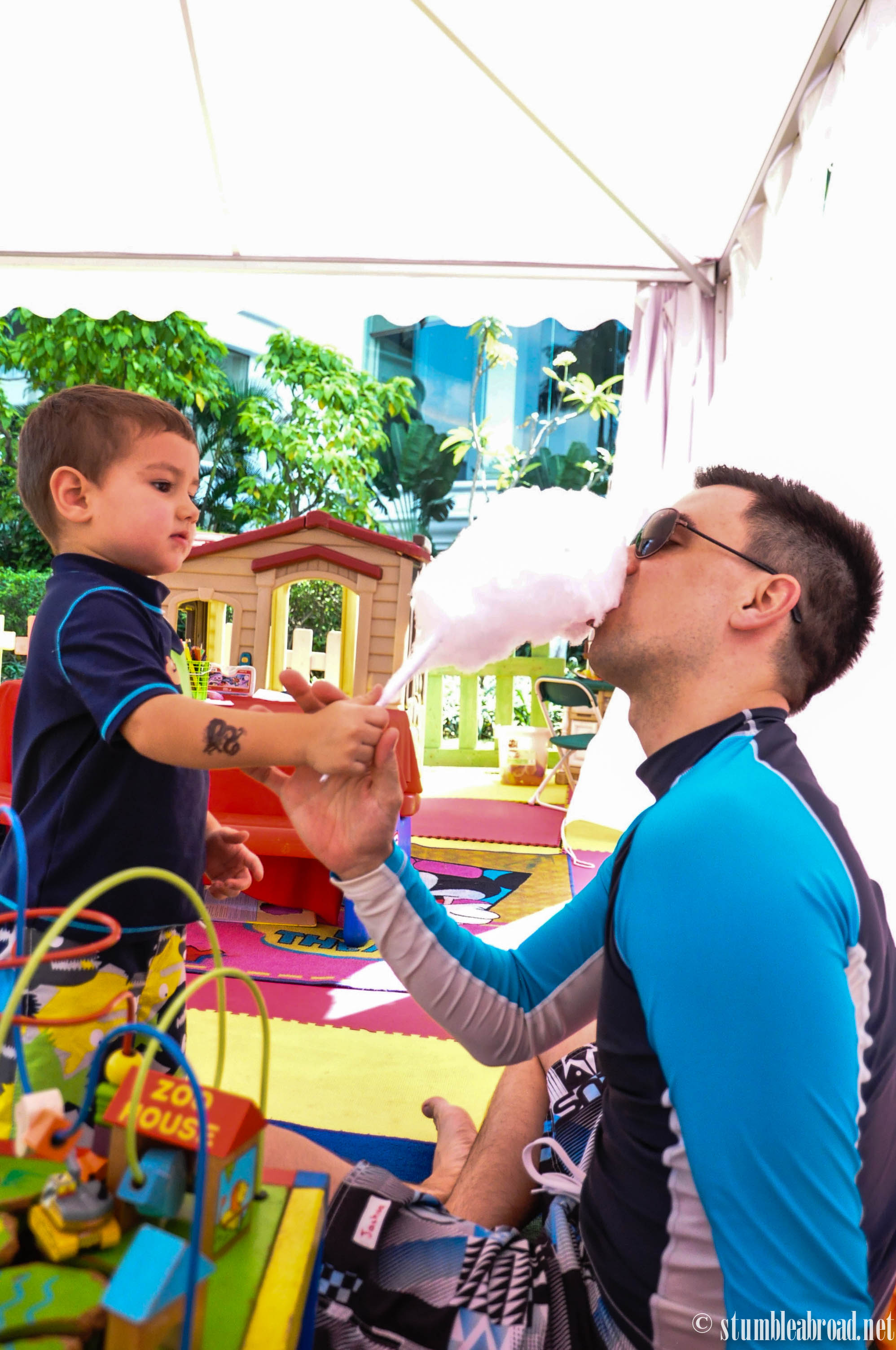 A big hit among the boys was the free flow of cotton candy and popcorn made right on site. Evan had actually never eaten cotton candy and his first experience with it was a very successful one (if success is measured on how much cotton candy a toddler can eat). The boys gobbled down their treats with the iced tea and water that was offered in the play tent.