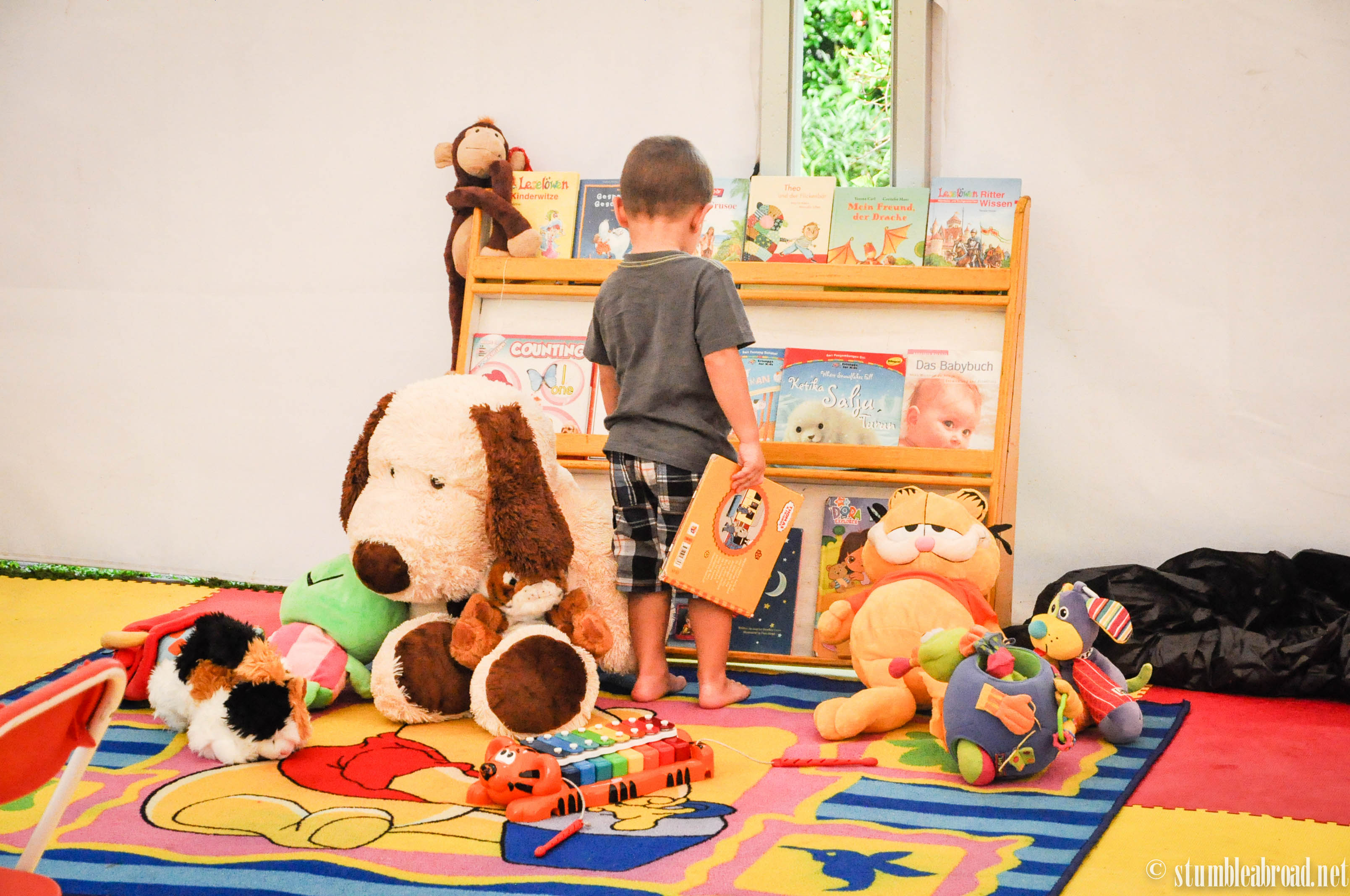 The second time we visited the play area was set up on the gardens. I loved the lush greenery and the boys loved the freedom to run back and forth from the bouncy castle to the cars, to the play tent. The play tent had an incredible array of activities for kids of all ages. Books, kids movies, tons of legos, a play house, a play kitchen, a crafting table and a huge quantity of toys for all tastes.
