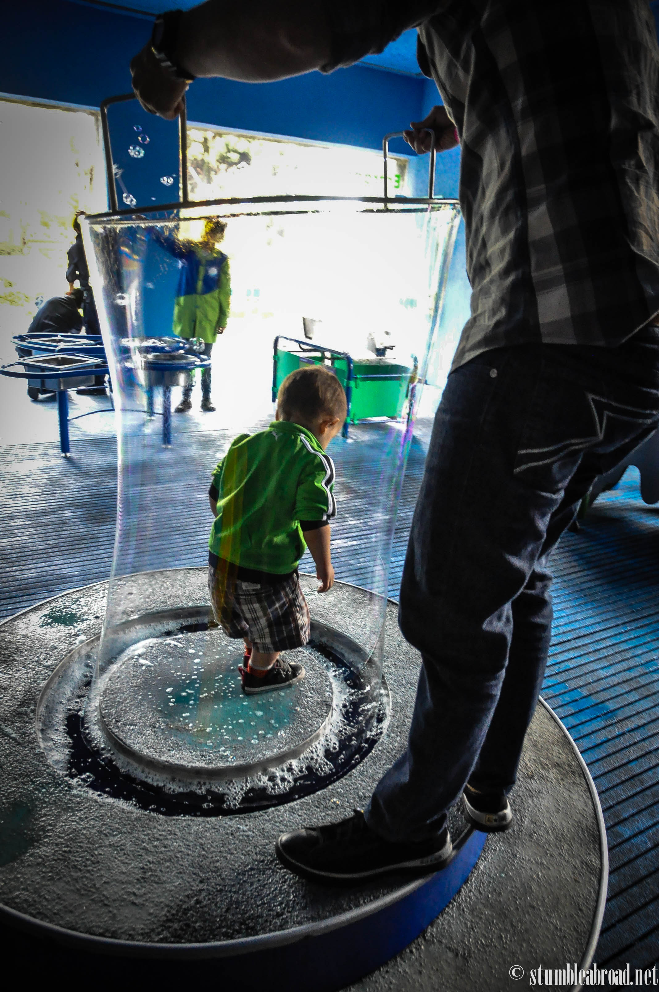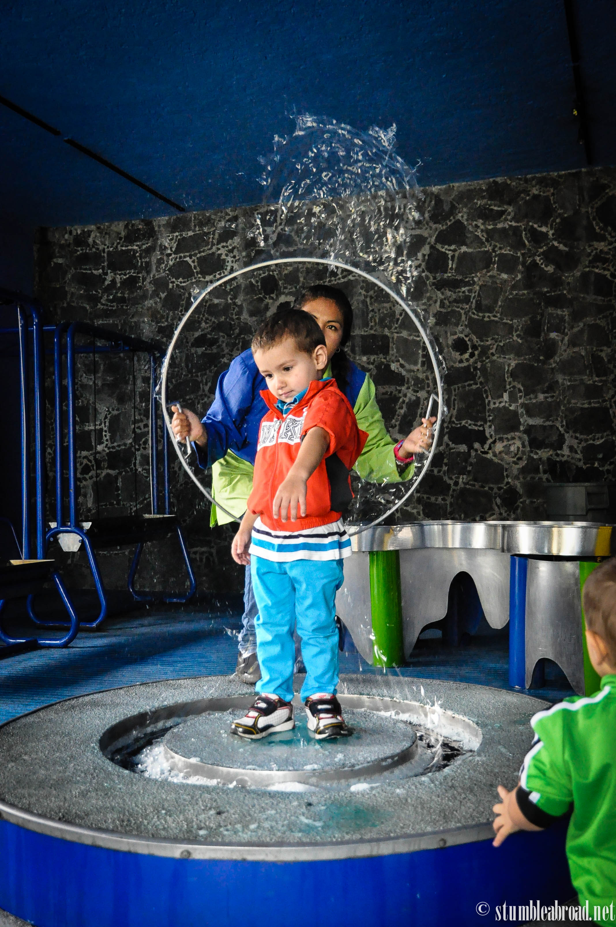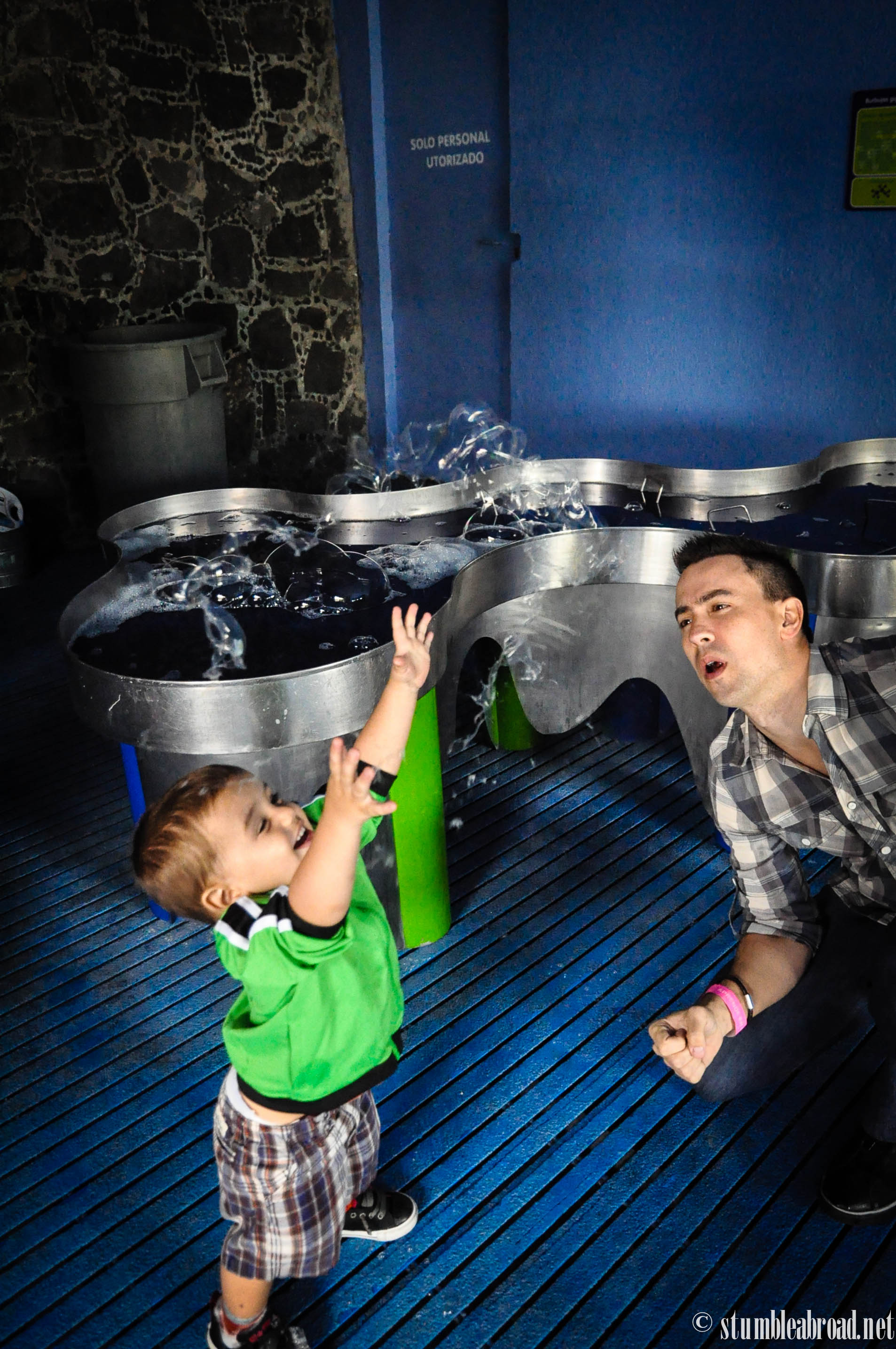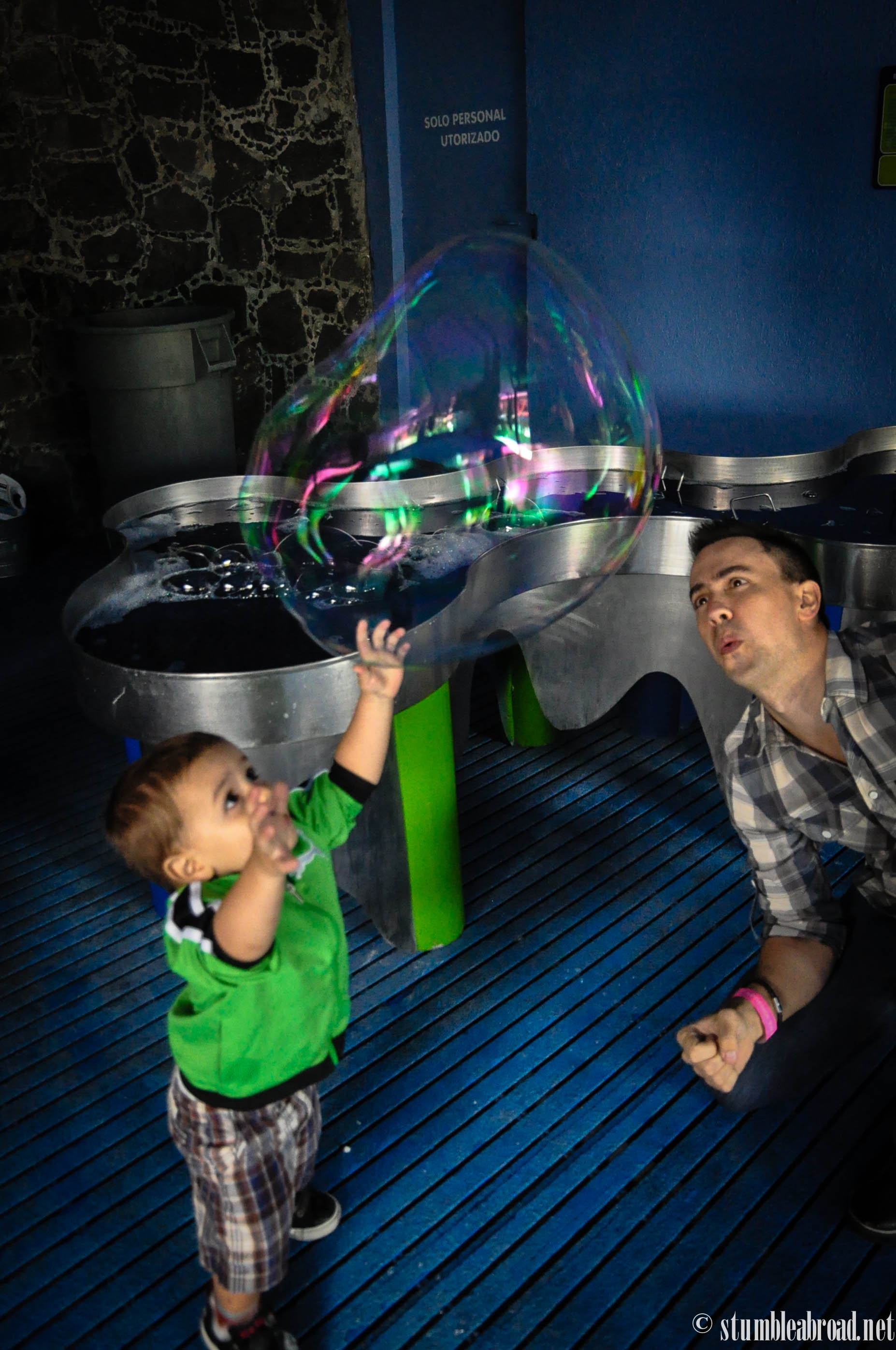 Right by the playground is the Bubble Play area. If you have seen pictures of kids “inside” a giant bubble, this is the place where the magic happens. Every time I have visited the Papalote I have had to wait in line for at least half an hour to get into the widely acclaimed bubble play area. We were so lucky to be able to go right in and stay there as long a we wished for. Or at least until the boys were too wet to play comfortably. More friendly cuates greeted us as we entered this bubble paradise. Bubbles abounded and the fun was unstoppable. Evan loved blowing his own bubbles and Josh made a huge effort to make bubbles himself but ended up soaked in glycerin filled liquid. Josh even decided to clean his shoes and stepped into the bubble formula after he was surrounded by a bubble.