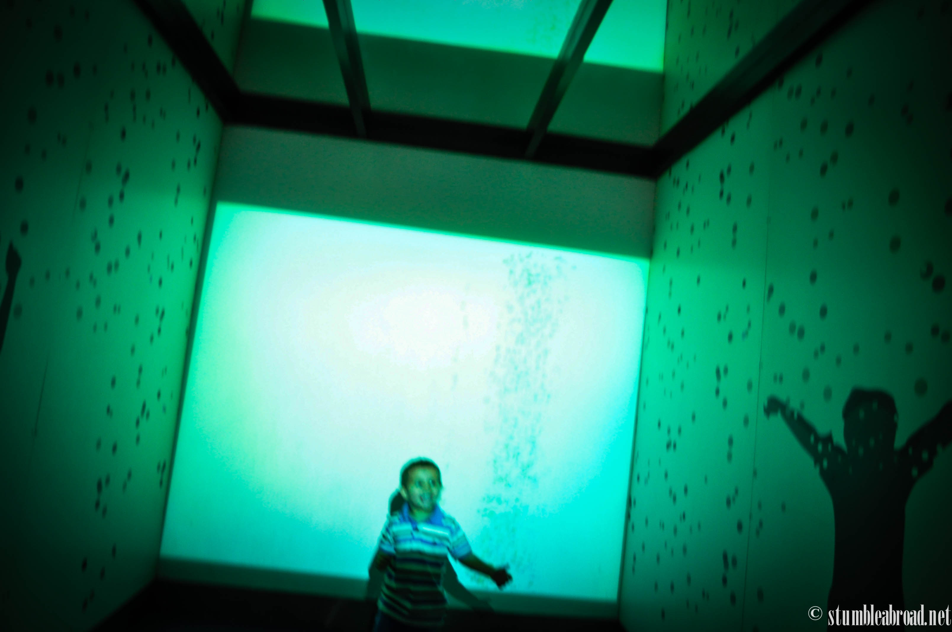 The further we explored the museum the more fun the boys had. We arrived in a physical challenge area where Josh was a pro at running on the human-size hamster wheel and Evan was intent on walking along with his daddy on some sort of plank creation. Evan had a blast chasing his shadow around and even enjoyed making a still picture movie that ended up having his hand in the scene more often than not.