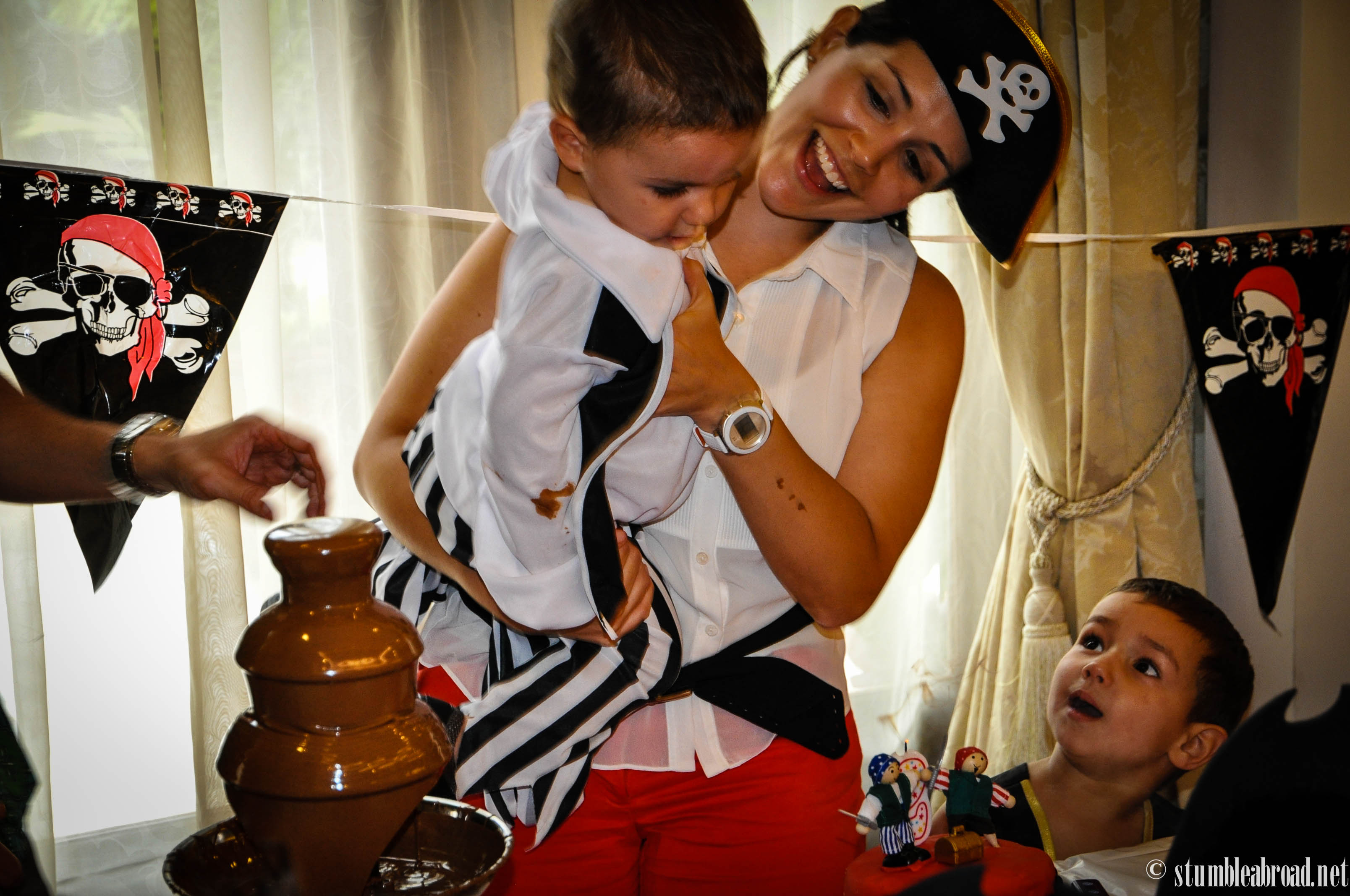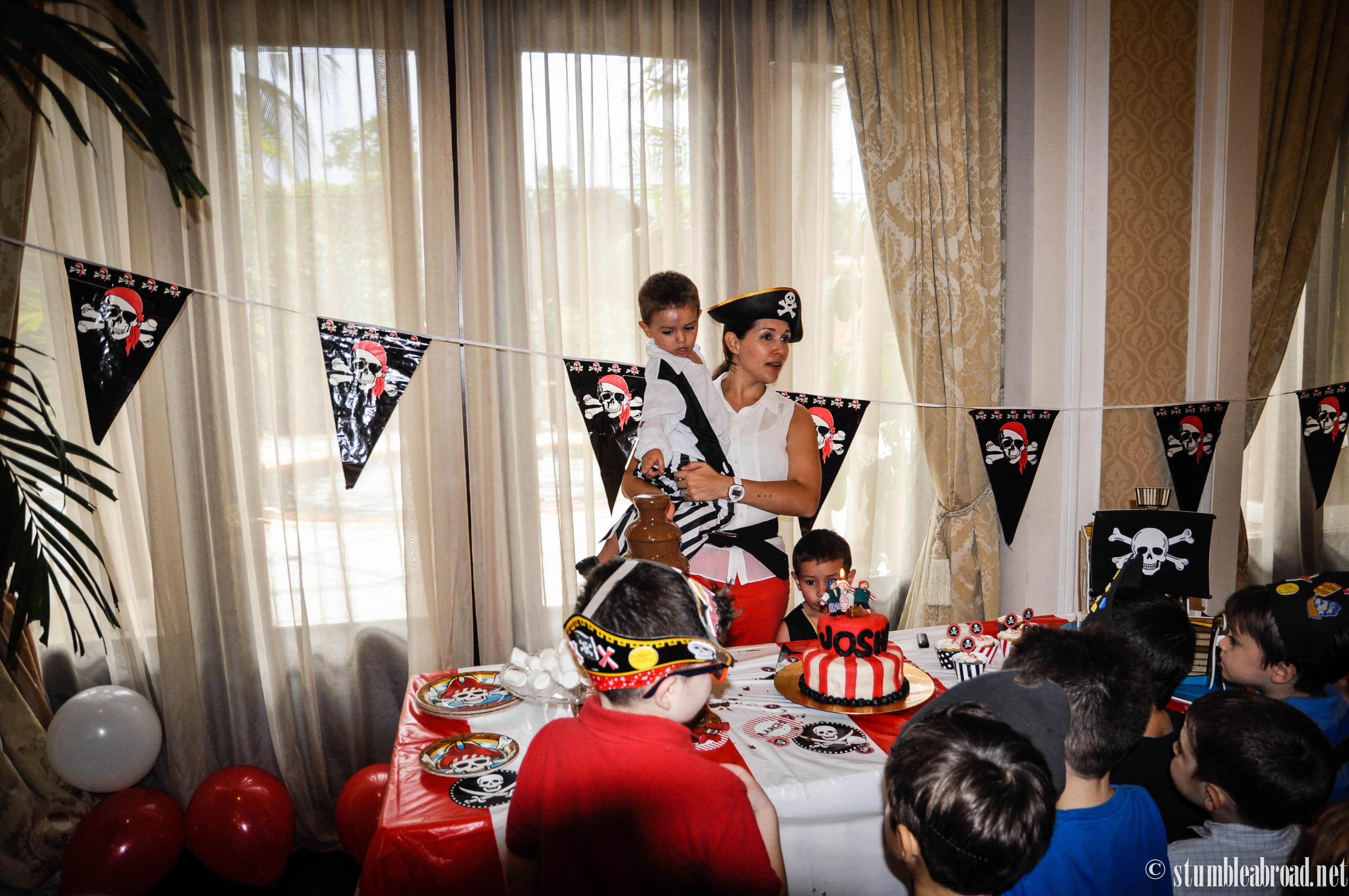 Last year we celebrated Joshua’s birthday with a nautical themed party. This year we kept it oceanic and organized a pirate party, pirate ship and all. I have come to realize that the older the kids get, the less pictures I am able to take since I have to make sure everyone is kept alive and bruise free so please bear with me as I am only able to post a few pics of the party. I totally forgot to take a picture of the food spread and by the time I wanted to take pics of the tables they were all hmm semi-destroyed.