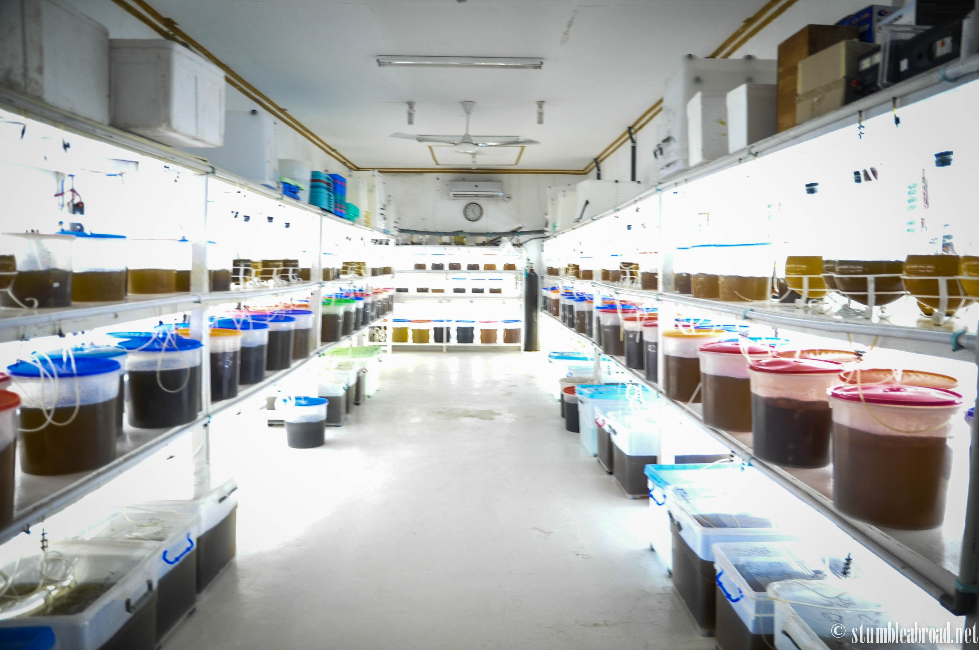 After looking at the tiny oysters in the lab with a microscope we were led to a very cold room where the oysters aliment is grown and kept. Oysters consume plankton and according to their age the kind of formula they have to eat. Each of the containers was thoroughly controlled and any changes to the contents was recorded carefully. We realized how much thought and work is put into each tiny oyster and appreciated the value of the pearls.