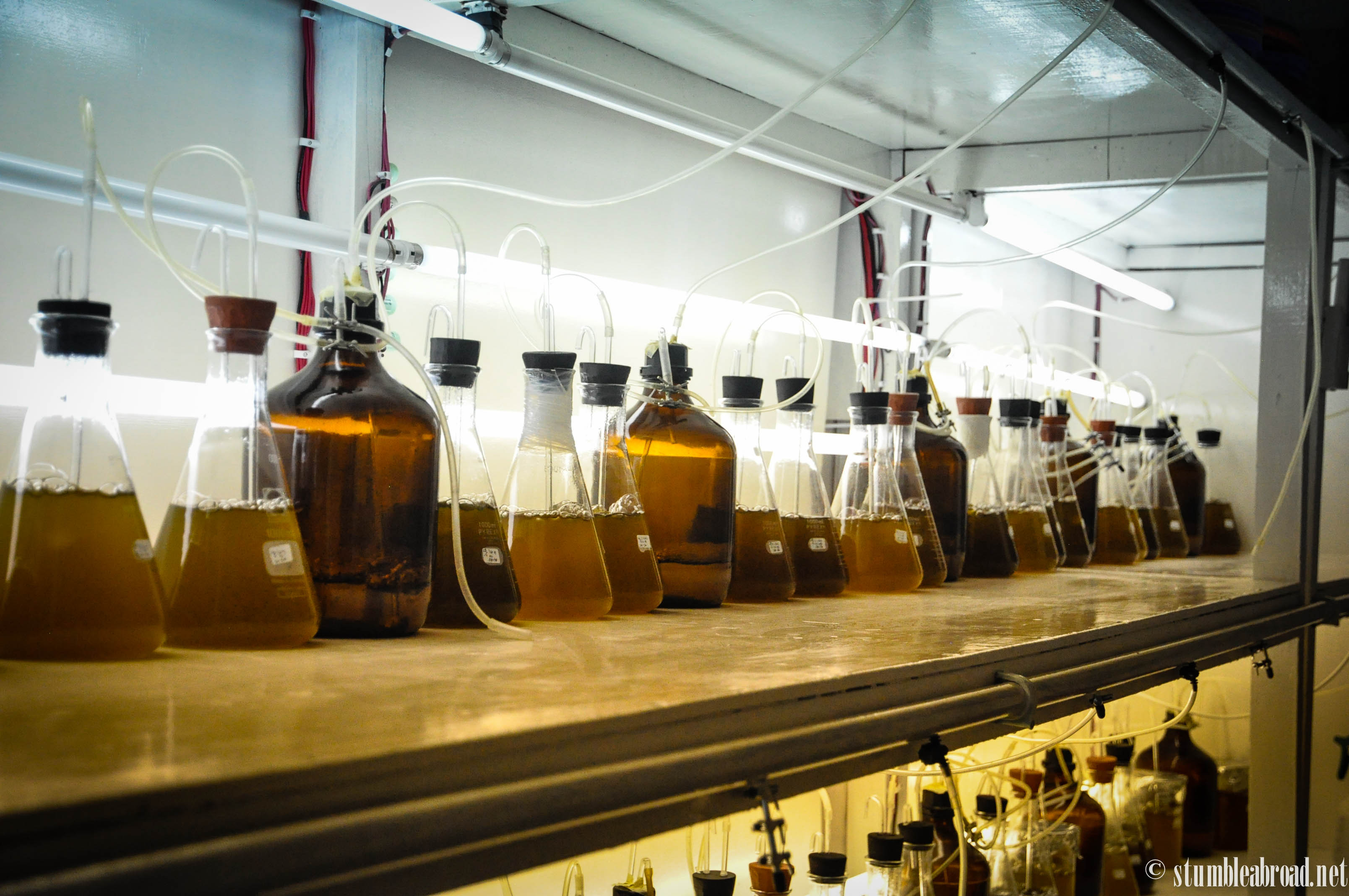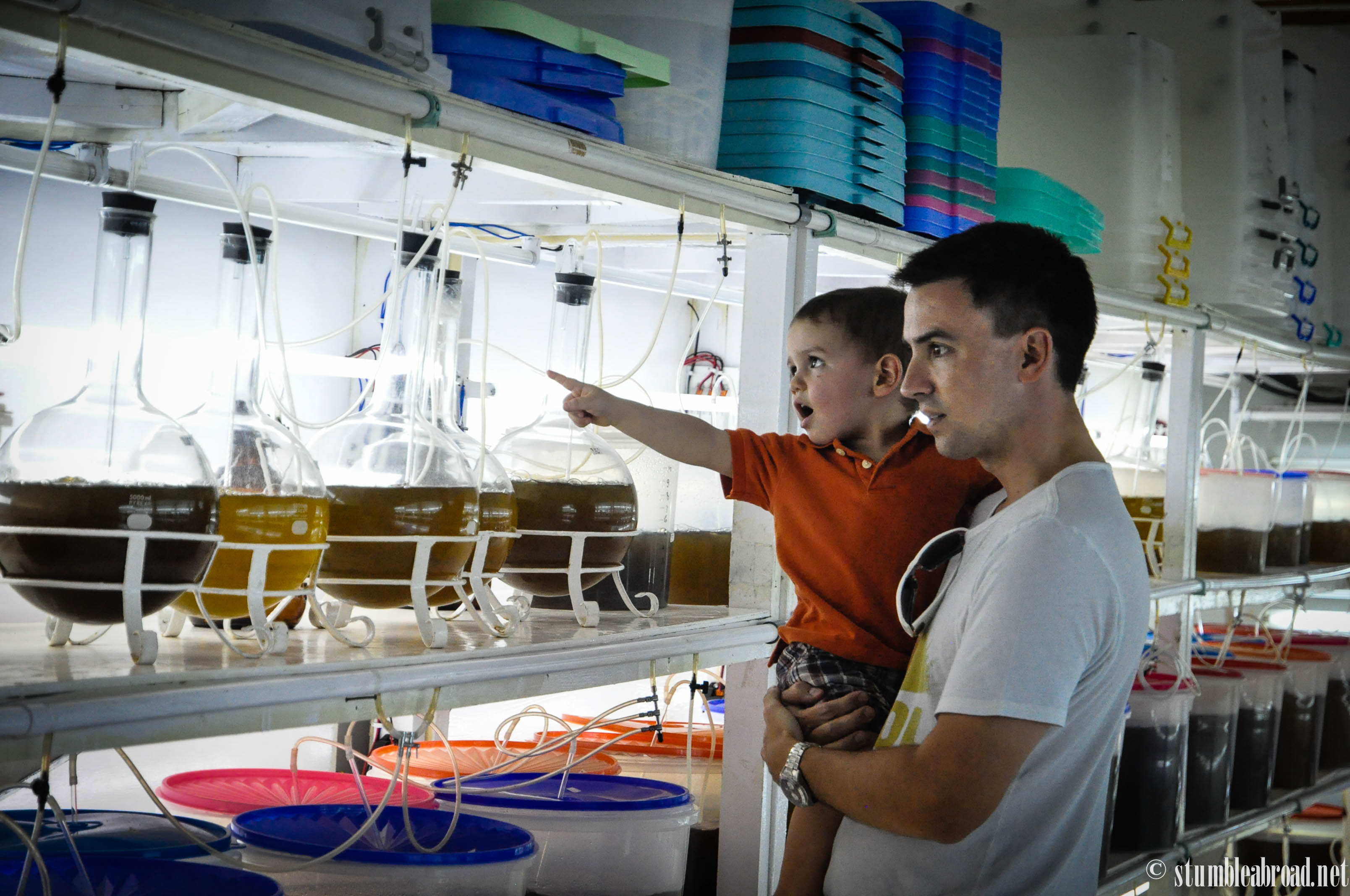 After realizing how much work is put into cultivating one single oyster and using this opportunity to see how Evan’s comparative skills were (which is bigger?, which is the biggest?) we headed inside where we were introduced to the genesis of the baby oysters. At the lab we saw huge tanks of what seemed to be simple water but in fact was a special formula whose aim was to foster the growth of millions of microscopic baby oysters. We were able to see the tiny baby oysters thriving in the water although they only look like speckles. We were told that the glitter-sized baby oysters have to be in a controlled environment in order to survive and that marine biologists supervise every single change in temperature and nutrient measure in order for them to actually make it.