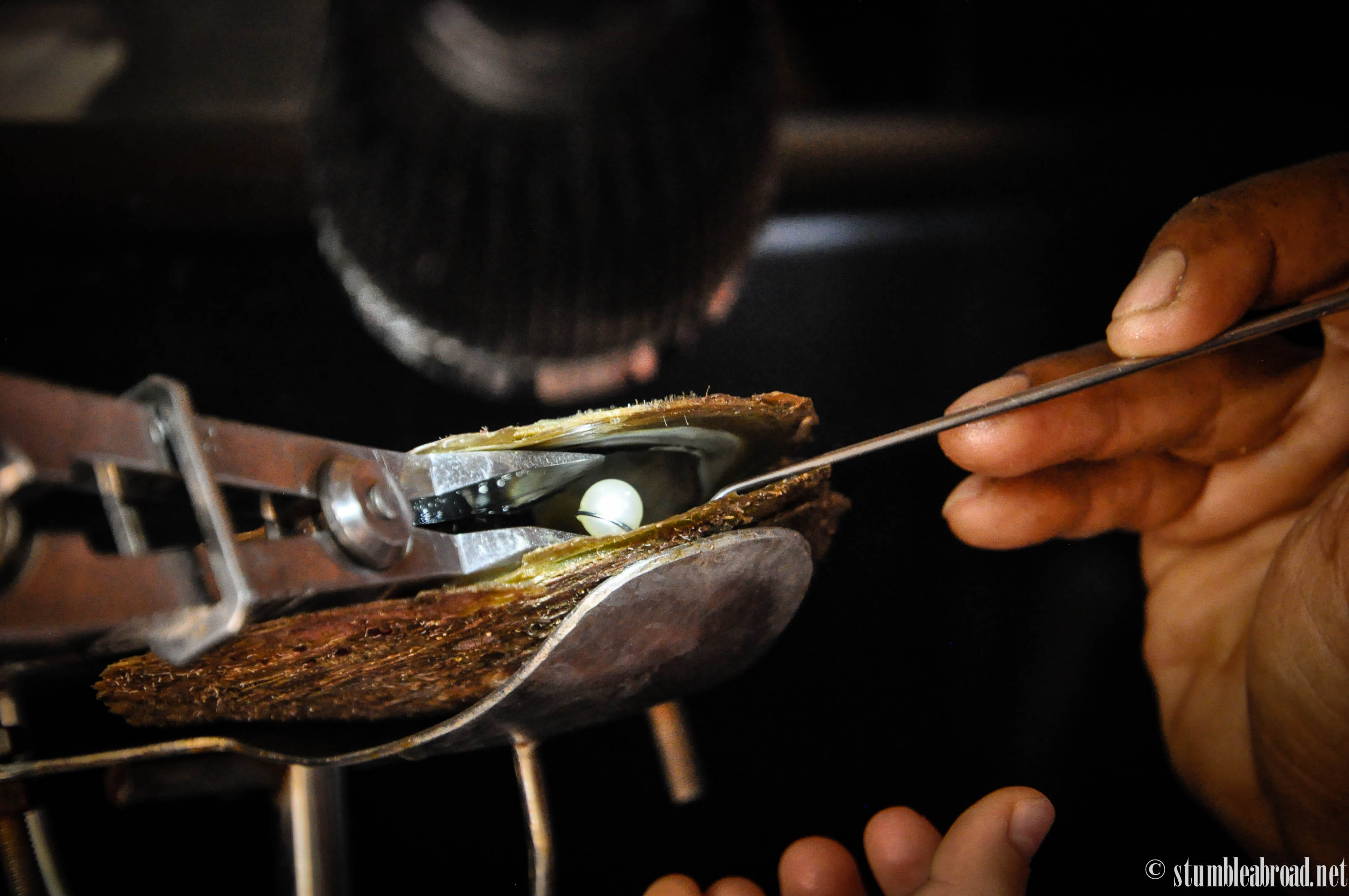 After we were done exploring the lab, we headed outside again and were able to see pearl-cultivation in action. The pearl expert was showing us how each oyster is used to create a pearl. In essence the process consists of inserting a tissue graft from a donor oyster, upon which a pearl sac forms, and the inner side covers the graft with nacre creating a gorgeous luster. We were awestruck to find out that they have to do this process one by one and understood why some of this little spheres can be so costly.
