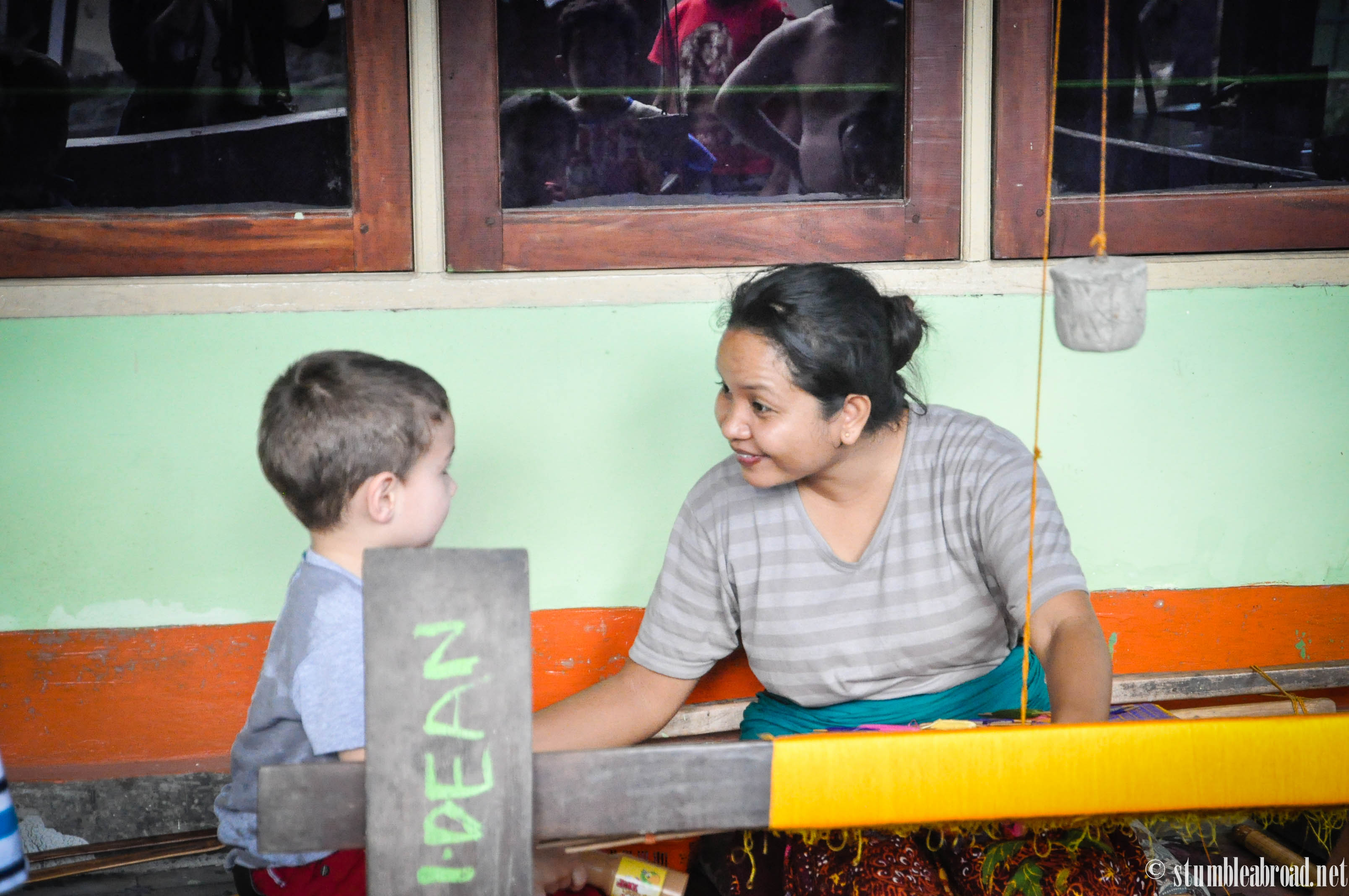 When we arrived at the weaving village I was impressed to see how well-organized and ran the co-op is. We were told that we could purchase some textiles at the end of our tour and then were led into the weaving village. Evan made friends right away and lead the way with our amazingly well-spoken tour guide. One of the weaving ladies herself.