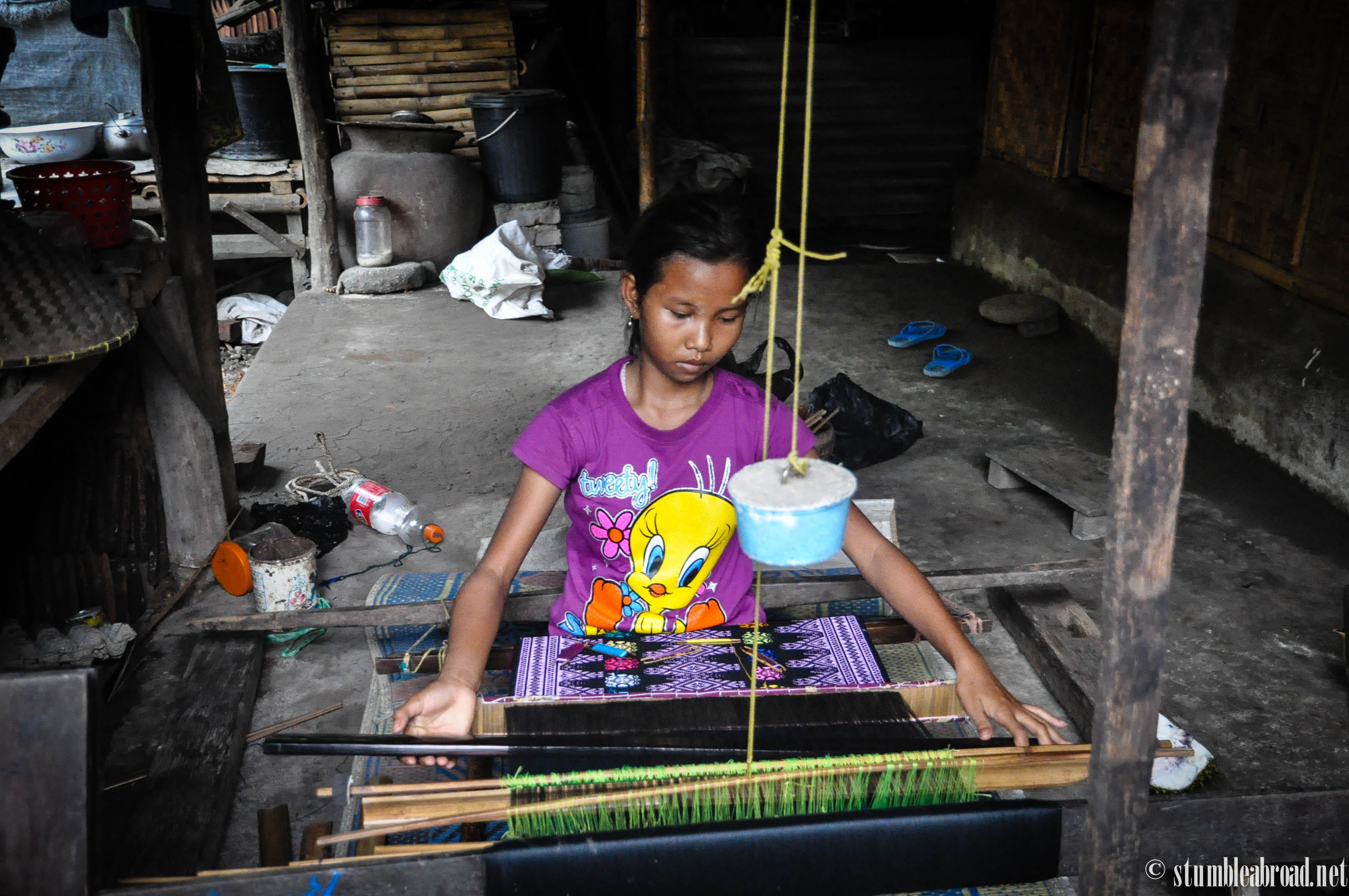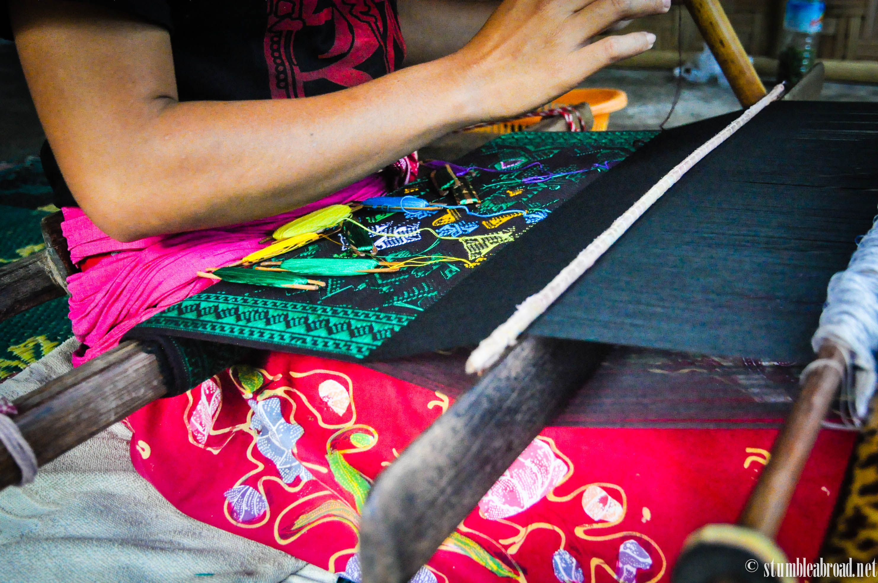 We were offered to go further into the kampung but the boys were started to get tired and we knew we had about an hour long ride to our hotel. We made one last stop to observe a young girl work on her textiles. The guide told us that in order for them to be able to get married they need to be able to weave. Little girls are taught the craft as early as 8 years old . This girl was making a beautiful table runner and I was very concentrated on her craft.